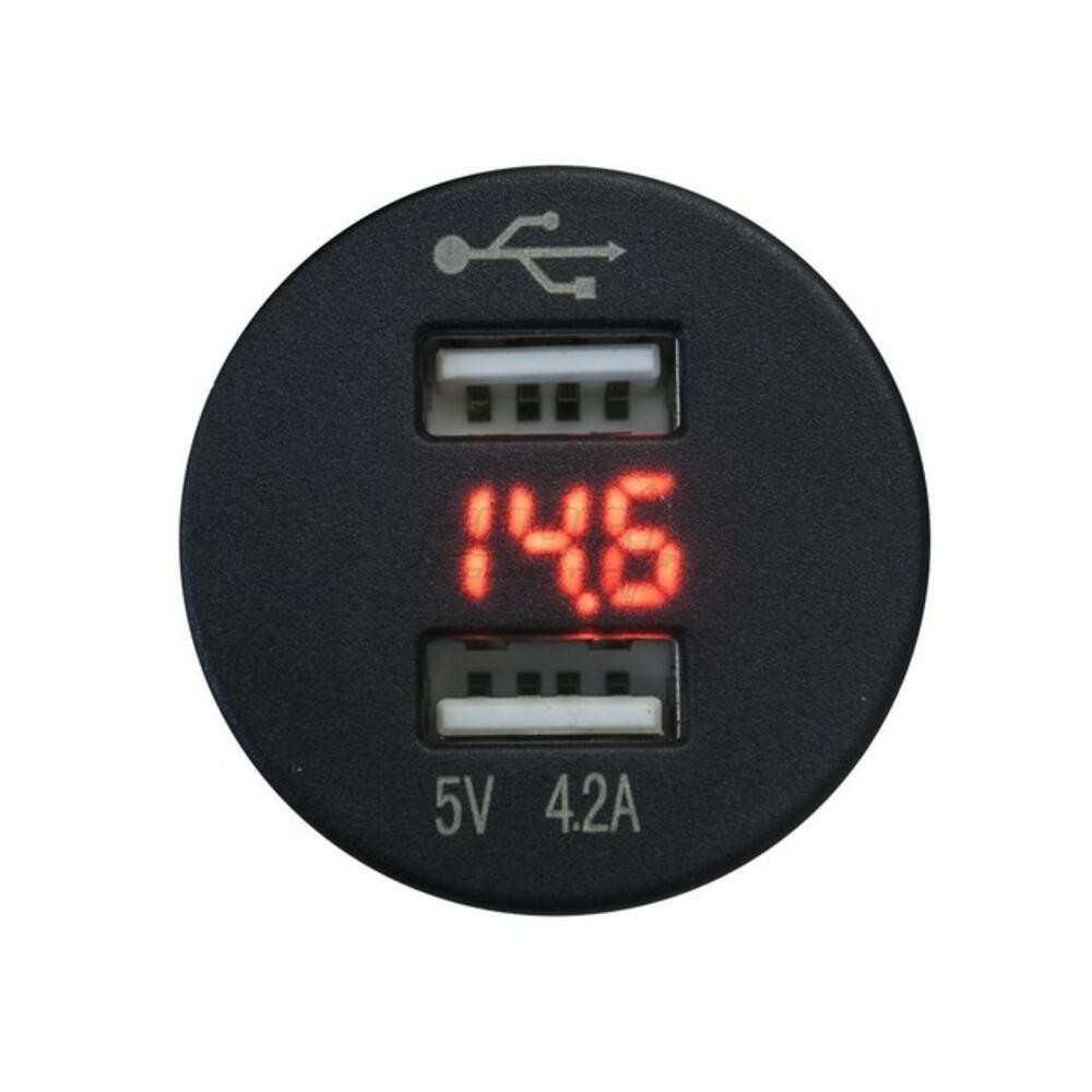 Dual USB-charger with voltage display. Can be flush mounted to 27 mm hole. Works with 12 aAsennusreikä/Mounting hole: 27mm