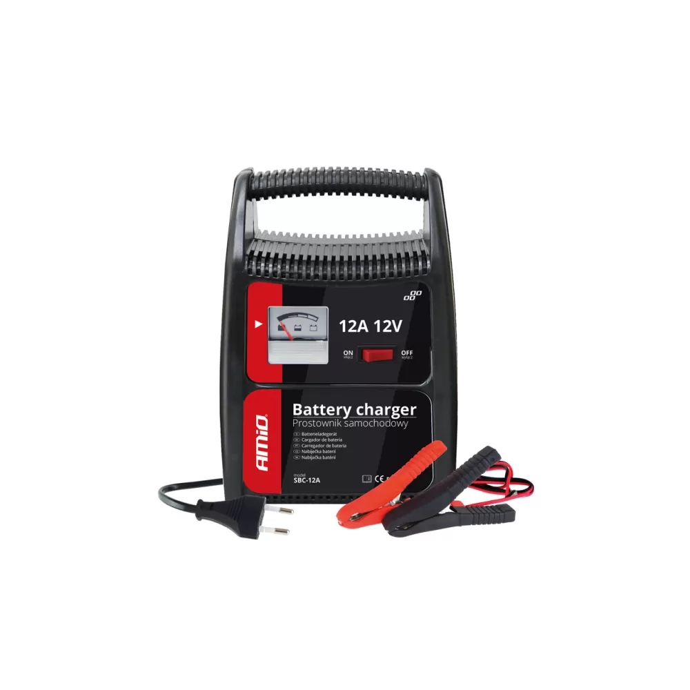Φορτιστής μπαταρίας 12V 12Α από την εταιρεία ΑΜΙΟ, πολωνικής προέλευσης. Περίβλημα από ABS, γρήγορη φόρτιση μπαταριών μολύβδου οξέος, ακροδέκτες φόρτισης με προστατευτικό