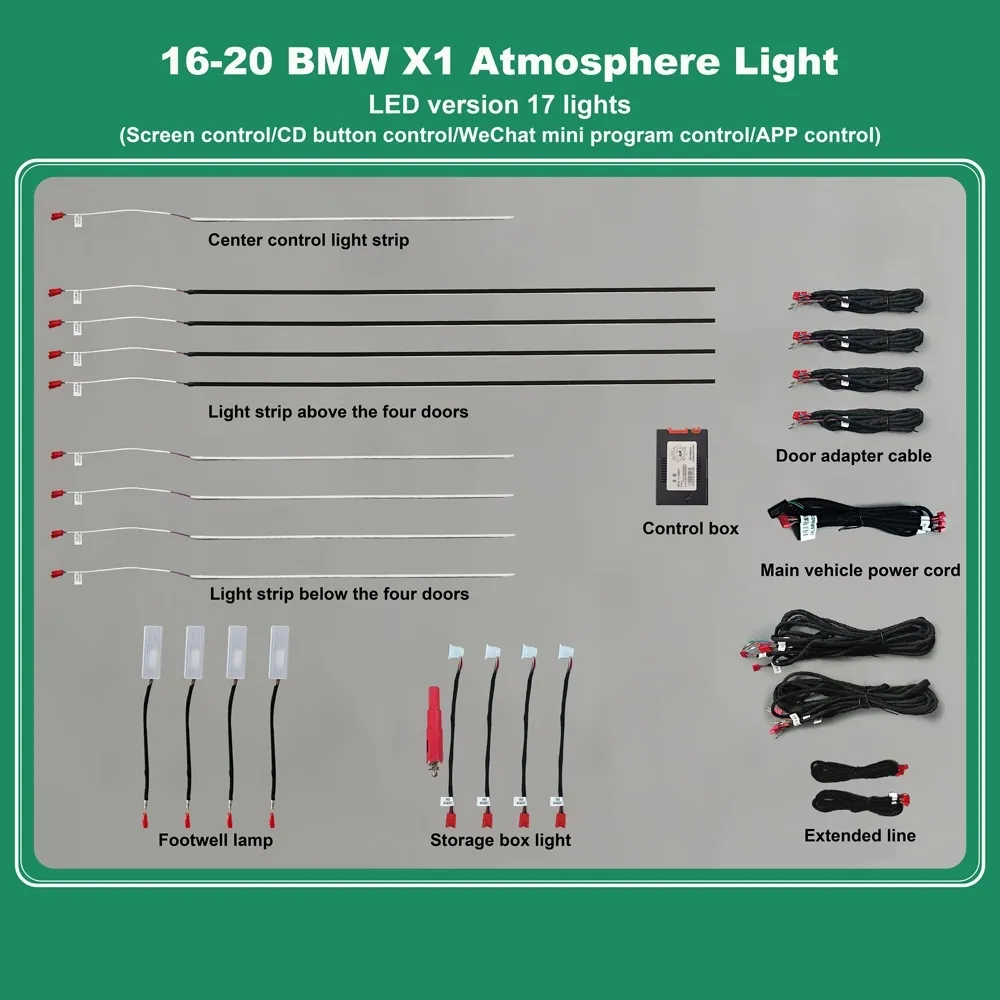 - Standard 17pcs lights (4 door handle lights, 4 door outline lights, 4 door storage box lights, 4 footwell lights, 1 central light).